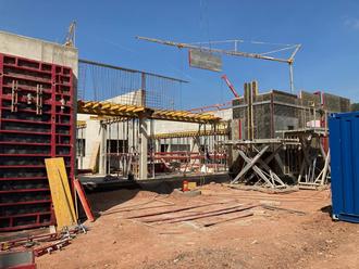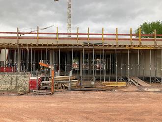 Einer der nächsten Schritte ist neben der Betonage der Erdgeschossdecke die Montage der Stahlkonstruktion des festen und verfahrbaren Daches ab Juli 2023 zu montieren.