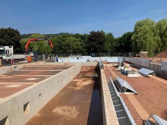 Aber auch im großen Freibadbecken sind die ersten großen Veränderungen zu erkennen. Das 50 m Becken wurde teilverfüllt und die Fundamente für die Linienbewässerung betoniert. Innerhalb des alten Beckens wurden zwei Trennwände einbetoniert, um das zukünftige Mehrzweckbecken mit Breitrutsche und 4 x 50 m Bahn von dem Erlebnisbecken mit Strömungskanal zu trennen.
