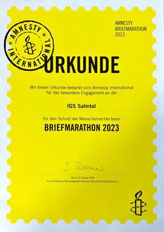 Seit 2018 nimmt die IGS Salmtal jährlich am Amnesty Briefmarathon teil. Auch in diesem Schuljahr konnte sich die Schule wieder für zehn Menschen einsetzen. Eine Woche lang wurden erfolgreich zahlreiche Briefe verfasst, weshalb Amnesty International der IGS in Salmtal für diesen Einsatz für die Menschenrechte diese Urkunde übersendet hat.