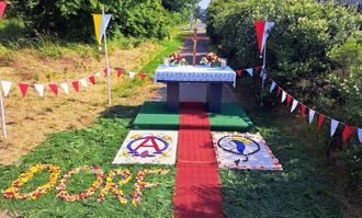 In guter Tradition hat der Stadtteil Dorf an Fronleichnam wieder einen Altar mit schönen Bildmotiven aufgestellt. Ortsvorsteher Gerhard Hoffmann dankt den fleißigen Helfern für ihren Einsatz.