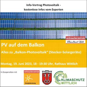 Der Vortrag „Photovoltaik auf dem Balkon“ findet statt am Montag, den 19. Juni von 18 bis 19:30 Uhr, im Rathaus, Saal Lieser, Schloßstraße 11. Die Teilnahme ist kostenlos. Es wird um unverbindliche Anmeldung per Email an klimaschutz@stadt.wittlich.de gebeten.