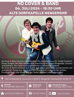 Am Samstag, den 6. Juli 2024, veranstaltet der Freundes- und Förderkreis "Alte Dorfkapelle St. Johannes, Wengerohr e.V." um 18.30 Uhr ein Konzert mit "No Cover & Band", die mit ihrer "Musik für Alltagshelden" begeistern können. Einlass in die Alte Dorfkapelle in der Bernkasteler Str. 14 ist ab 18 Uhr, der Eintritt ist frei, Spenden sind gerne willkommen.