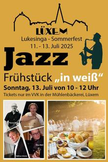 Am Sonntag, den 13. Juli 2025, laden Mark Schelzke & Friends von 10 bis 12 Uhr zum Jazz-Frühschoppen auf dem Festplatz in Lüxem ein. Genießen Sie Jazz vom Feinsten in stilvollem Ambiente und auf Wunsch gleichzeitig ein Frühstück in Weiß! Das Jazz-Frühstück steht übrigens in zwei Varianten zur Wahl: herzhaft/süß oder vegetarisch. Der Zugang zum Festplatz ist frei – Wer am Frühstück mit festen Sitzplätzen teilnehmen möchte, muss sich eine Karte im Vorverkauf in der Mühlenbäckerei Lüxem sichern.