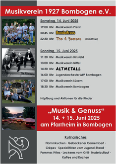 Am diesem Wochenende lädt der Musikverein 1927 Bombogen e. V. zu seinem Sommerfest Musik & Genuss in den Pfarrgarten in Bombogen gegenüber der Kirche ein.