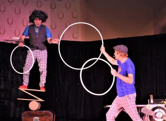 Waghalsige Akrobatik und geschickte Jonglage mit Professor Knödeldaddel (Bille Billewitz, links).