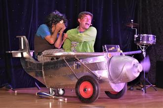 „Bloß nicht runterschauen …“ – Gehilfe Hubert (Micha Messermann, rechts) hat alles im Griff beim Start des Flugzeugs… (Fotos: Anke Freudenreich)