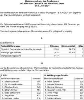 Der Wahlausschuss der Stadt Wittlich hat in seiner Sitzung am 18. Juni 2024 das Ergebnis der Wahl zum Ortsbeirat wie folgt festgestellt: