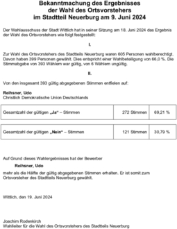 Der Wahlausschuss der Stadt Wittlich hat in seiner Sitzung am 18. Juni 2024 das Ergebnis der Wahl des Ortsvorstehers wie folgt festgestellt:
