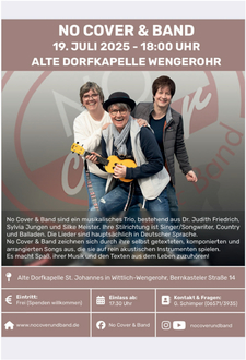 Am Samstag, den 19. Juli 2025, veranstaltet der Freundes- und Förderkreis "Alte Dorfkapelle St. Johannes, Wengerohr e.V." um 18.00 Uhr ein Konzert mit "No Cover & Band", die mit ihrer "Musik für Alltagshelden" begeistern können. Einlass in die Alte Dorfkapelle in der Bernkasteler Str. 14 ist ab 17.30 Uhr, der Eintritt ist frei, Spenden sind gerne willkommen.