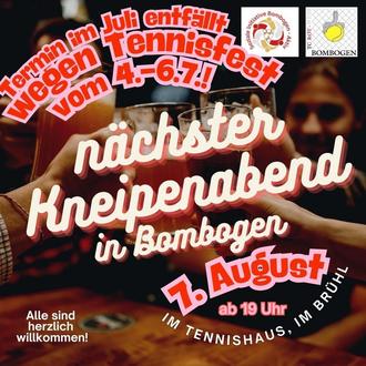 Gemeinsam mit der Initiative „Bombogen Aktiv“ veranstaltet der Tennisclub Rot-Weiß Bombogen jeden ersten Donnerstag im Monat einen Kneipenabend im Clubhaus Im Brühl. Aufgrund unseres Sommerfests vom 04. bis 06. Juli 2025 fällt der Kneipenabend im Juli aus.