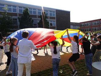 Und dann ging’s endlich los: Michael Hansen, der Schulleiter der Schule, begrüßte zusammen mit der Orientierungsstufenleiterin Christina Henzgen alle kleinen und großen Gäste sehr herzlich und rief dann alle Schülerinnen und Schüler dazu auf, sich als Klasse erstmals mit den neuen Klassenlehrern zu treffen, um sich beim Ballspielen, beim gemeinsamen Lösen von kniffligen Matheaufgaben und bei kreativen Spielen im Englischunterricht erstmals kennenzulernen. Das gemeinsame Spielen mit den Schwungtüchern machte am Ende der Kükenfete allen sehr viel Spaß! Die Schule hofft, dass diese erlebte Freude als Vorfreude auf die neue Schule über die Sommerferien erhalten bleibt.