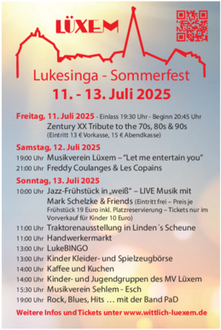 Am Wochenende vom 11. Juli bis zum 13. Juli 2025 findet erneut das Lukesinga Sommerfest in Lüxem statt. Es ist das neue Format des Festes, dass sich aus der gemeinsamen Zusammenarbeit von örtlichen Vereinen aus der 1000-Jahr-Feier im Jahr 2023 in Lüxem entwickelt hat. Am Sonntag, den 13. Juli erwartet die Besucher nach dem Jazzkonzert und dem Frühstück in weiß ein abwechslungsreiches Tagesprogramm für die ganze Familie.