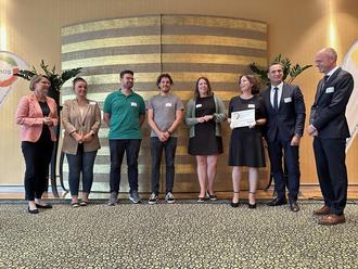 Gruppenfoto mit Bildungsministerin Dr. Stefanie Hubig, Geschäftsführer Dr. Markus Warnke, Bürgermeister Joachim Rodenkirch, Oberbürgermeister David Langner und Vertretungen der an dem Projekt teilnehmenden Grundschulen.