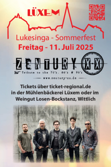 Den Auftakt macht am Freitagabend die Band Zentury XX, die mit ihrer mitreißenden Hommage an die 70er, 80er und 90er Jahre das Publikum begeistern wird. Einlass ist ab 19:30 Uhr, das Konzert beginnt um 20:45 Uhr. Eintrittskarten sind bereits bei ticket-regional für 13 € erhältlich, Abendkasse 15 €. Weitere Vorverkaufsstellen: Mühlenbäckerei Lüxem und Weingut Losen-Bockstanz, Wittlich.