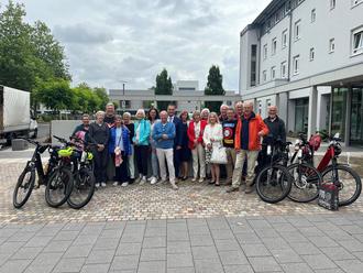 Gruppenfoto mit den Radsportfreunden aus der Partnerstadt Boxtel vor dem Rathaus (Foto: Sebastian Klein).