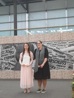 Schulleiterin Marianne Schönhofen (rechts) überreicht Dicle Polat den Bernard Clemens-Förderpreis für den besten Realschulabschluss (Fotos: Nicole Artmayer-Pazen).