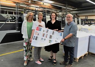 Die Macher des Säubrennerbuches (v.l.n.r.: Beate Rossbach, Nikolaus BASTIAN Druck und Verlag GmbH, Diana Gerhards, Eva Eiring, Albert Klein) überzeugen sich beim Andruck von seiner Qualität. (Foto: Werbeagentur Eiring)