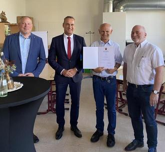 V.l.n.r.: Ortsvorsteher Mario Wellenberg, Bürgermeister Joachim Rodenkirch, Rektor Gerhard Huber und Schulrat Stefan Gerber nach der Übergabe der Ruhestandsurkunde (Foto: Privat).