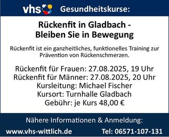 | 92390.25 | Rückenfit für Männer in Gladbach, Schwerpunkt: Beweglichkeit, Mittwoch, 20:00 – 21:00 Uhr (M. Fischer, Turnhalle Gladbach) | 27.08.2025 | 12x | 48,00 € |