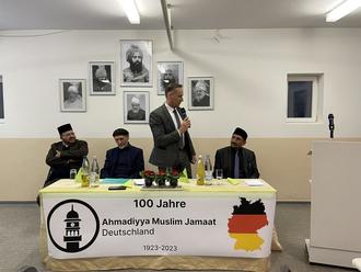 Labied Mehmood, zuständig für externe Angelegenheiten der lokalen Gemeinde, begrüßte die Gäste zum Jubiläumsempfang. Gefolgt sind der Einladung Vertreter aus der Politik, Stadtgesellschaft, Religion, Kultur und viele weitere Freunde. Nach der Begrüßung wurden die Geschichte und Aktivitäten der lokalen AMJ Gemeinde präsentiert, ehe ein Video über die 100-jährige Geschichte der Gemeinde in Deutschland gezeigt wurde.