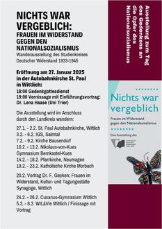 Am 27. Januar jährt sich der bundesweite Tag des Gedenkens an die Opfer des Nationalsozialismus. Er nimmt als Jahrestag Bezug auf die Befreiung des Vernichtungslagers Auschwitz-Birkenau durch die Rote Armee 1945. Anlässlich der diesjährigen Gedenkveranstaltung wird die Ausstellung ‚Nichts war vergeblich: Frauen im Widerstand gegen den Nationalsozialismus‘ in der Autobahnkirche St. Paul in Wittlich eröffnet, begleitet von einem einführenden Vortrag von Dr. Lena Haase (Universität Trier). Im Fokus der Gedenkveranstaltung und der Ausstellung steht der Mut von Frauen, die sich in der Zeit des Nationalsozialismus gegen das Regime stellten, jede auf ihre eigene Art und Weise. Ihre widerständigen Aktionen waren vielfältig und ihr Mut hervorstehend. Die Gedenkfeier beginnt in der Autobahnkirche St. Paul mit einem traditionellen Gedenkgottesdienst um 18:00 Uhr, daran schließt die Ausstellungseröffnung um 19 Uhr an. Die Ausstellung wird bis Anfang März durch den Landkreis Bernkastel-Wittlich wandern. Am 20. Februar findet hierzu um 18:30 Uhr ein Fachvortrag in der Kultur- und Tagungsstätte Synagoge statt, in welchem Frau Dr. Frauke Geyken über Frauen im Widerstand zum Nationalsozialismus referieren wird.