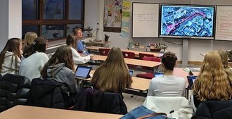 Schülerinnen des Erdkunde-Leistungskurses stellen ihre Ergebnisse zur Innenstadtentwicklung vor und diskutieren mit Vertreterinnen der Stadtverwaltung über Aufenthaltsqualität, Nachhaltigkeit und Klimaanpassung (Foto: Privat).