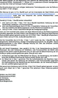 wenn sie nicht innerhalb eines Jahres seit dieser Bekanntmachung des Bebauungsplanes schriftlich gegenüber der Stadt Wittlich unter Darlegung des die Verletzung begründenden Sachverhaltes geltend gemacht worden sind. § 215 Abs.1 Satz 1 BauGB gilt entsprechend, wenn Fehler nach § 214 Abs. 2a BauGB beachtlich sind.