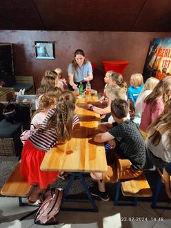 Der Film des Tages war „Wolkig mit Aussicht auf Fleischbällchen“, der die Kinder mit seinen lustigen Charakteren und Abenteuern begeisterte. Passend zum Film – der Hauptdarsteller Flint erfindet eine Maschine, die Essen produziert – wurde den jungen Besuchern nach der Vorführung die Möglichkeit gegeben, ebenfalls zu experimentieren. So wurden vom Personal der Kita Brautweg und des Kinopalastes drei verschiedene Experimente zum Mitmachen angeboten. Ca. 30 Kinder nahmen mit Freude daran teil.