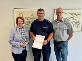 Patrick Grancher (Mitte) wurde am 21. Juli 2025 in einer kleinen Feierstunde durch die erste Beigeordnete Elfriede Meurer in Anwesenheit des Fachbereichsleiters Jan Mußweiler zum Hilfspolizeibediensteten der Stadtverwaltung Wittlich bestellt