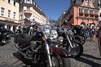 Chromblitzende Harley-Davidsons auf dem Marktplatz in Wittlich.