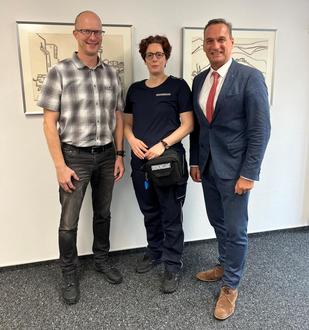 Im Rahmen einer kleinen Feierstunde am 4. August 2025 erfolgte die Bestellung durch Bürgermeister Joachim Rodenkirch in Anwesenheit des Fachbereichsleiters Jan Mußweiler (1.v.l.) (Foto: Selina Schuler).
