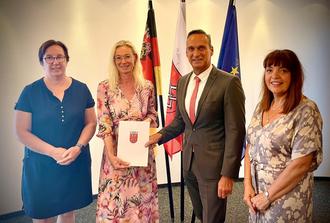 Bürgermeister Joachim Rodenkirch gratulierte Petra Hoffmann (2. v. l.) am 10. August 2022 zum 40-jährigen Dienstjubiläum. Den Gratulationen schlossen sich die Personalratsvorsitzende Christiane Schmitz-Hayer (1. v. r.) sowie die stellvertretende Fachbereichsleiterin I Melanie Schlösser (1. v. l.) gerne an (Foto: Rainer Stöckicht).