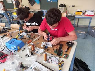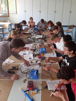 Im mehrstündigen Workshop bauten die hochkonzentrierten und motivierten Schüler*innen nach einer Einführung durch Prof. Stolz in die Technik des Lötens und einem theoretischen Input zum Aufbau von Schaltungen eine Powerbank zum Laden von Smartphones, eine Smartphone-Boombox, ein CD-Discolight, eine kleine USB-Taschenlampe, zudem einen Tesla-Transformator und elektronische Lauflichter, so genannte moving lights.