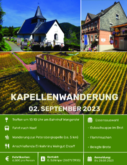 Der Freundes- und Förderkreis Alte Dorfkapelle St. Johannes Wengerohr e.V. veranstaltet am Samstag, den 2.09.2023, eine Kapellenwanderung. Geplant ist die Bahnfahrt nach Neef, die Fahrtkosten belaufen sich auf 6,50 Euro pro Person. Abfahrt ist um 13.10 Uhr am Bahnhof Wittlich-Wengerohr. Ab Neef findet eine Wanderung von ca. 5 km zur Petersbergkapelle mit aussichtsreichem Rückweg über die Klosterruine Stuben statt. Das abschließende gemütliche Beisammensein wird mit einer Einkehr im Weingut Croeff in Neef verbunden. Alle sind herzlich willkommen. Zur genaueren Planung bitten wir um Anmeldung bis zum 28.08.2023 unter Tel. 06571/3935 bei G. Schimper.