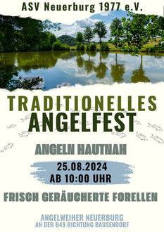 Am 25. August 2024 findet ab 10 Uhr seit langer Zeit wieder ein traditionelles Angelfest am Weiher des Angelsportvereins Neuerburg am Wallenborn statt. Alle sind herzlich eingeladen, dieses Fest mit uns zu feiern.