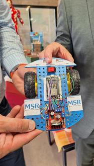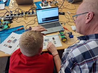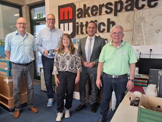 Die Firma MSR-Schaltanlagen unterstützt das Angebot des Makerspace durch eine Spende von 500 Euro. Geschäftsführer Daniel Beerbohm überzeugte sich beim Besuch eines Robot-Car-Workshops in den Sommerferien selbst davon, dass die Gelder für die technische Grundbildung von Jugendlichen gut angelegt sind. Gemeinsam mit Bürgermeister Rodenkirch ließ er sich von den beiden ehrenamtlichen Workshopleitern Hans-Peter Pesch und Klaus Diegelmann das Kurskonzept erläutern und nutzte die Gelegenheit zusätzlich für einen kurzen Gesamtrundgang in der Werkstatt mit Makerspace-Mitarbeiterin Wilma Görgen.
