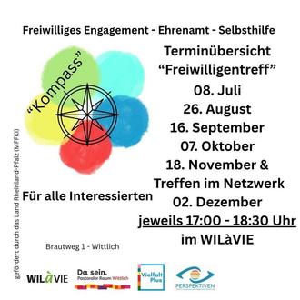 Der Freiwilligentreff „Kompass“, eine Kooperation von Perspektiven e.V. Wittlich, WILàvie und dem Pastoralen Raum Wittlich, lädt am Dienstag, 26. August, um 17 Uhr zum nächsten Freiwilligentreff in den „Offenen Treff“ WILàvie, Brautweg1, ein. Die Themen des Tages wurden aus den Anregungen der vorangegangenen Treffen ausgewählt und greifen damit direkt die Interessen der Engagierten auf. Dieses Mal stehen der Austausch zu den Engagement-Bereichen „Alternatives Wohnen im Alter“ sowie „ADHS- Selbsthilfe für Angehörige“ im Mittelpunkt. Darüber hinaus wird das Format „Suche/Biete Engagement“ präsentiert, bei dem Vereine, Initiativen und Organisationen ihren Unterstützungsbedarf an Ehrenamtlichen vorstellen können und Interessierte selbst ehrenamtliche Unterstützung anbieten können. Ziel ist es, Menschen und Projekte in der Region unkompliziert miteinander zu vernetzen und so gemeinsames Engagement zu fördern. Der Freiwilligentreff „Kompass“ versteht sich als offener Ort für Begegnung, Austausch und gegenseitige Unterstützung – für alle, die sich engagieren möchten oder bereits aktiv sind. Kontakt für Rückfragen und Anmeldungen: E-Mail: kontakt@perspektiven-wittlich.de, Telefon: 0170 4582948.