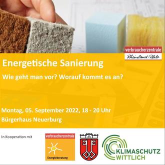 Die Veranstaltung findet am 5. September, 18 Uhr, im Bürgerhaus Neuerburg (Kiefernstraße 6, 54516 Wittlich-Neuerburg) statt. Um unverbindliche Anmeldung an klimaschutz@stadt.wittlich.de wird gebeten.