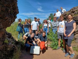 Das Bild zeigt die Schülerinnen und Schüler des Cusanus-Gymnasiums Wittlich während einer kleinen Verschnaufpause im Rahmen ihrer gewässeranalytischen Untersuchungen (Fotografin: Stefanie Weisgerber-Puhl).