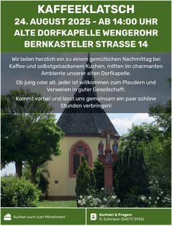 Der Freundes- und Förderkreis Alte Dorfkapelle St. Johannes Wengerohr e.V. lädt für Sonntag, den 24.08.2025, zum gemütlichen Beisammensein ab 14 Uhr in die Alte Dorfkapelle, Bernkasteler Str. 14, ein. Bei Kaffee und selbstgebackenem Kuchen ist Zeit für anregende Gespräche. Wir freuen uns sehr über eine rege Teilnahme, Kuchenspenden sind selbstverständlich gerne willkommen.