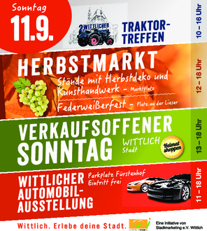 Ebenfalls am Sonntag öffnen die weit über 100 Einzelhändler ihre Läden zum dritten verkaufsoffenen Sonntag in diesem Jahr. Von 13 bis 18 Uhr haben alle Besucher die Möglichkeit durch die Innenstadt zu flanieren, gemütliche Stunden beim Einkaufsbummel zu genießen und sich von der Vielfältigkeit der Wittlicher Gewerbetreibenden zu überzeugen. Die Aussteller des Herbstmarktes auf dem historischen Marktplatz ergänzen wie bereits in den vergangenen Jahren das Angebot in der Wittlicher Innenstadt. Im reichhaltigen Angebot findet man unter anderem handgefertigte Herbstkränze, selbstgenähte Kinderkleidung, ausgefallene Schmuckkreationen und liebevoll gebastelte Dekorationen. Diese vielen Aktionen rund um das zweite Septemberwochenende lassen fast keine Wünsche offen und stimmen die Besucher ein auf einen hoffentlich goldenen Herbst.