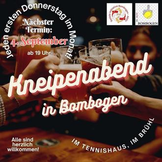 Zusammen mit der Initiative "Bombogen Aktiv" veranstaltet der Tennisclub Rot-Weiß Bombogen im Clubhaus Im Brühl am Donnerstag, 04.09.2025, ab 19:00 Uhr den nächsten Kneipenabend. Alle Bewohner aus Bombogen und den umliegenden Ortschaften sind herzlich willkommen! Genießt einen geselligen Abend mit erfrischenden Getränken und netten Gesprächen.