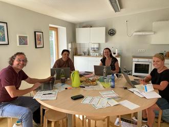 Das Foto zeigt die FamOS-Standortleitungen der Grundschulen Friedrichstraße, Wengerohr und Georg Meistermann und den Koordinator des Projektes v.r.n.l.: Jenny Klasen (Grundschule Friedrichstraße), Julia Feuerstrake (Grundschule Wengerohr) Jenni Bossmann (Grundschule Georg-Meistermann) und André Rieder. Es fehlt Jamie Kunz Grundschule Bombogen bei der Ausarbeitung des Programms und der Erstellung des Angebots- und Infoflyers (Foto: André Rieder).