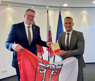 Als Zeichen gegenseitiger Wertschätzung zwischen der Stadt Wittlich und der Justizvollzugsanstalt Wittlich (JVA) sowie als Dank für die vielfältigen Kooperationen, z.B. im Bereich der Feuerwehr oder mit den Arbeitsbetrieben der JVA Wittlich, überreichte Bürgermeister Joachim Rodenkirch dem Anstaltsleiter Prof. Dr. Jörn Patzak eine Flagge der Stadt Wittlich. Prof. Dr. Patzak seinerseits stellte der Stadt Wittlich aus seinem Privatbestand eine druckfrische Ausgabe des von ihm mitverfassten Kommentars zum Betäubungsmittelrecht zur Verfügung. In dem Kommentar werden auch die neuen Regelungen zu Cannabis erläutert, mit denen sich die Stadt hinsichtlich des Besitzes von Cannabis, Konsumverboten in bestimmten Bereichen und Ansiedlung von Anbauvereinigungen beschäftigen muss.