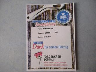 Am 17. August wurden beim achten Kronenkorkenfest in Bad Breisig, wo sich die vielen Kronkorkensammler zur Abgabe und Wiegen der Kronkorken treffen, 1.040,5 Kilogramm (kg) Kronkorken aus Wittlich dort an den Förderkreis Bonn E.V übergeben.