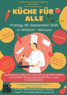 Am Freitag, 26. September, findet ab 16 Uhr im WILàvie in Wittlich (Brautweg 1) zum ersten Mal die "Küche für Alle" statt. Das Team vom WILàvie und vom Haus der Jugend sowie die foodsharing-Gruppe im Landkreis laden gemeinsam herzlich zum gemeinschaftlichen Kochen und Essen aus geretteten Lebensmitteln ein. Eingeladen sind ALLE, die Lust auf ein klimafreundliches Essen in Gesellschaft haben und sich über die Arbeit der ehrenamtlichen Lebensmittelretter von foodsharing informieren möchten - Jung und Alt, Wittlicher und Gäste aus anderen Orten. Mitmachen und Mitessen sind kostenlos und eine Anmeldung ist nicht erforderlich. Wer um 16 Uhr noch nicht zum Schnippeln dabei sein kann, kann gerne später zum Essen (ab ca. 18 Uhr) dazu stoßen.