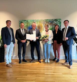 Zur Verleihung der Ehrennadel des Landes Rheinland-Pfalz an Michael Wagner (3.v.l.) gratulieren v.l.n.r.: Fraktionssprecher Stephan Lequen, Bürgermeister Joachim Rodenkirch, Monika Ritter-Wagner, Anja Vollmer als Vertreterin des Ortsvorstehers von Wengerohr und Landrat Andreas Hackethal (Foto: Privat).