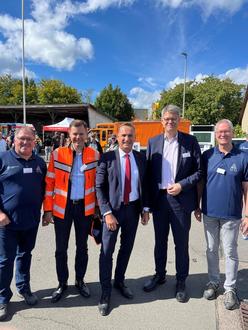 v.l.n.r.: Jürgen Mayer, Leiter der Autobahnmeisterei Wittlich, Dr. Michael Güntner, Vorsitzender der Geschäftsführung der Autobahn GmbH, Bürgermeister Joachim Rodenkirch, Bundesverkehrsminister Patrick Schnieder, Vorsitzender der Geschäftsführung, sowie Markus Gerhards, Direktor der Niederlassung West (Foto: Privat).