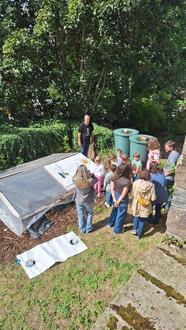 Den Auftakt bildete ein Besuch bei den Möhrbrennern im Garten von „Mehse Matti“, wo die Kinder eine kleine Biogasanlage entdeckten. Dort erklärte Uli Merle von den Möhrbrennern anschaulich, wie aus Essensresten „Pupsluft“ entsteht, die sogar brennt.