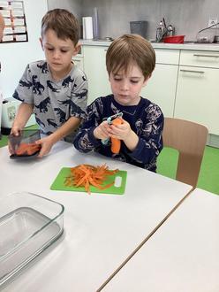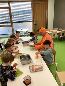 Am nächsten Tag folgte eine große Überraschung: Eine lebendige, übergroße Möhre besuchte die Kita. Schon ihr Auftritt sorgte für Gelächter und Staunen. Doch die Möhre brachte auch Arbeit mit: Gemeinsam mit den Kindern schälte sie Möhren für das geplante Grillfest. So lernten die Kinder, dass hinter jedem Fest auch Vorbereitung steckt – und dass man zusammen schneller ans Ziel kommt.
